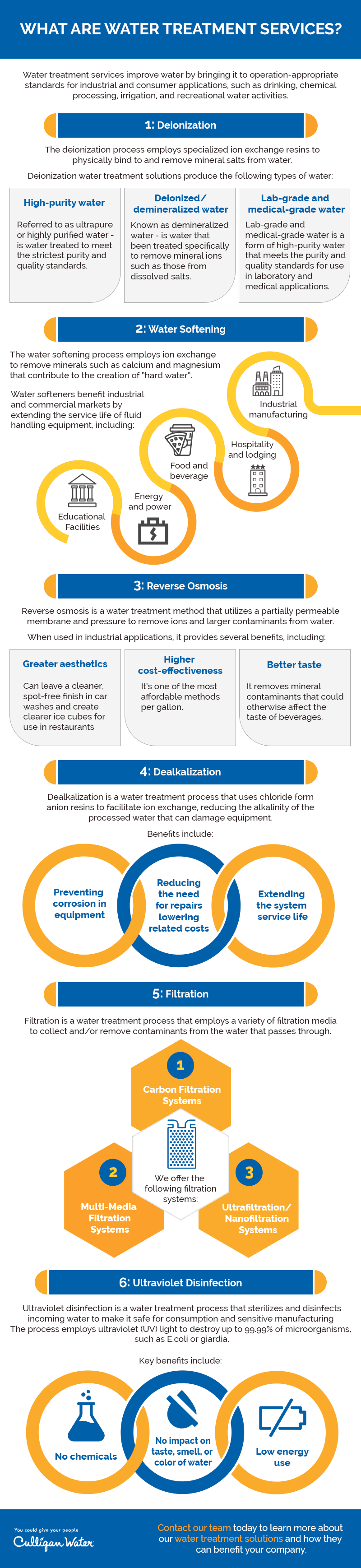 Water treatment services improve water by bringing it to operation-appropriate standards for industrial and consumer applications, such as drinking, chemical processing, irrigation, and recreational water activities. Generally, treatment processes focus on reducing or removing unwanted chemicals and contaminants, such as minerals and microorganisms.